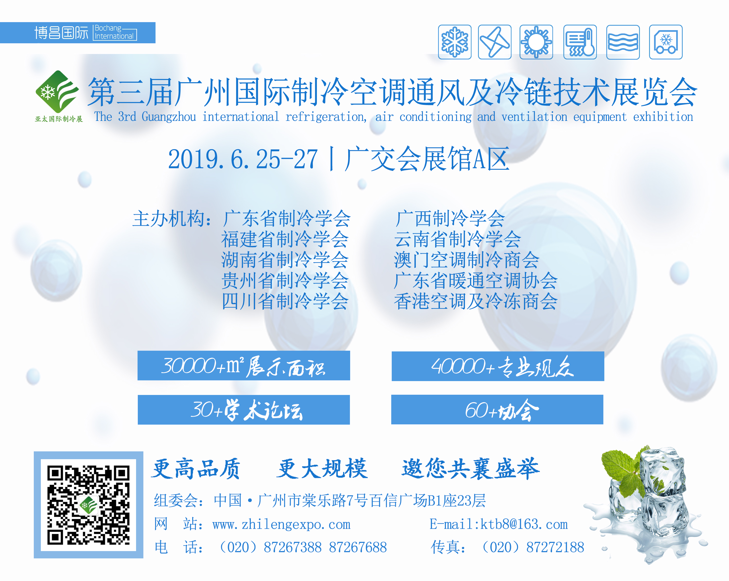 2019第三屆中國廣州國際制冷空調(diào)通風(fēng)及冷鏈技術(shù)展覽會﹝簡稱:亞太(廣州)國際制冷展﹞將于2019年6月25-27日在廣交會展館A區(qū)舉行,以“對接粵港澳大灣區(qū) 鏈接全球制冷市場”為主題,依托全球最大的制造基地和市場優(yōu)勢,預(yù)計展位面積30000平方米,來自世界30多個國家和地區(qū)的近500家企業(yè)參展,專業(yè)觀眾可達4萬余人,同期舉行2019“一帶一路”制冷空調(diào)產(chǎn)業(yè)創(chuàng)新創(chuàng)業(yè)大會等30多場高峰論壇,一次集產(chǎn)、學(xué)、研、用一站式高效交流的國際性行業(yè)盛會。