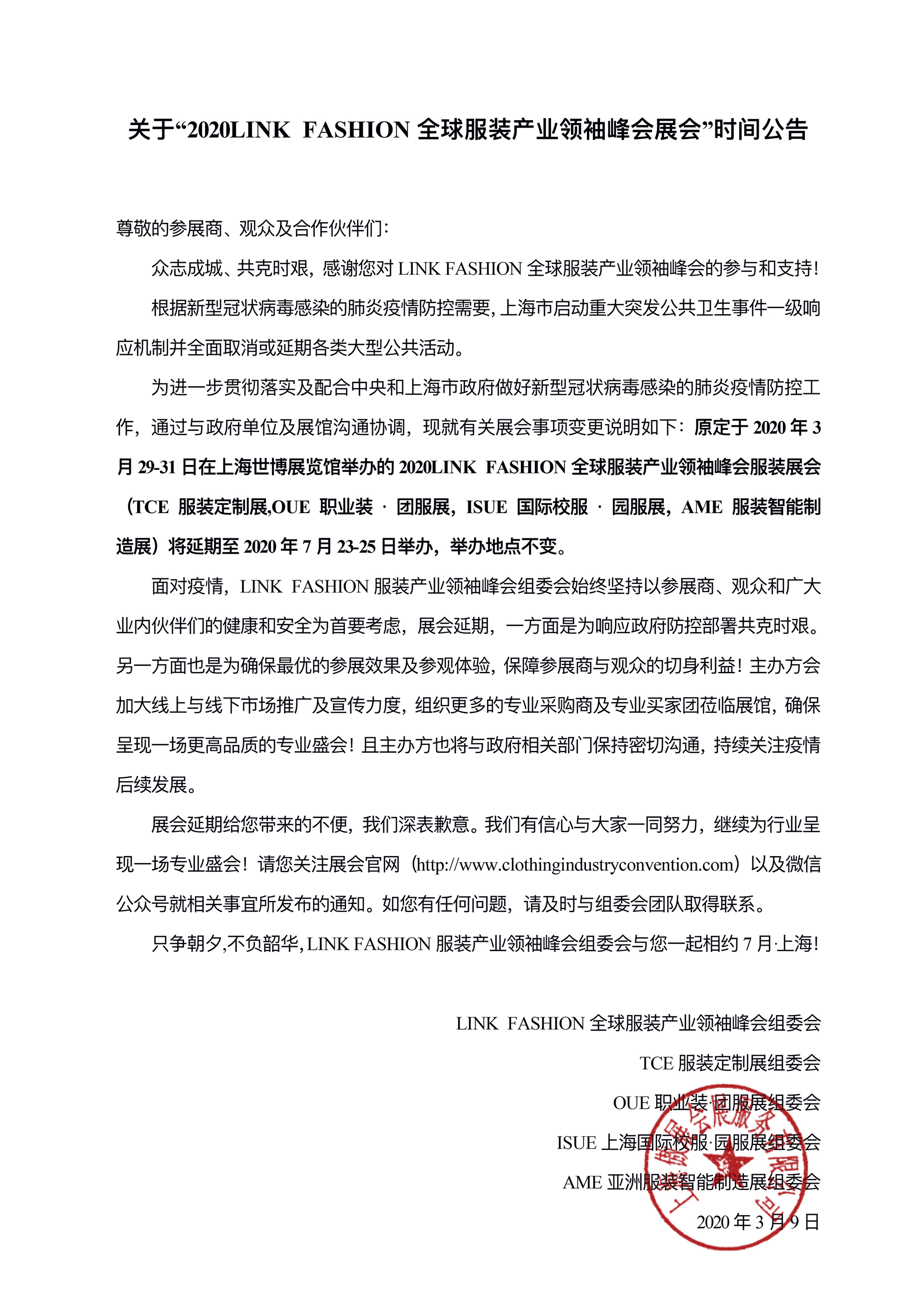 為進(jìn)一步貫徹落實(shí)及配合中央和上海市政府做好新型冠狀病毒感染的肺炎疫情防控工作,通過與政府單位及展館溝通協(xié)調(diào),現(xiàn)就有關(guān)展會(huì)事項(xiàng)變更說明如下:原定于2020年3月29-31日在上海世博展覽館舉辦的2020LINK FASHION全球服裝產(chǎn)業(yè)領(lǐng)袖峰會(huì)服裝展會(huì)(TCE服裝定制展、OUE職業(yè)裝·團(tuán)服展、ISUE國(guó)際校服·園服展、AME服裝智能制造展)延期調(diào)整如下: