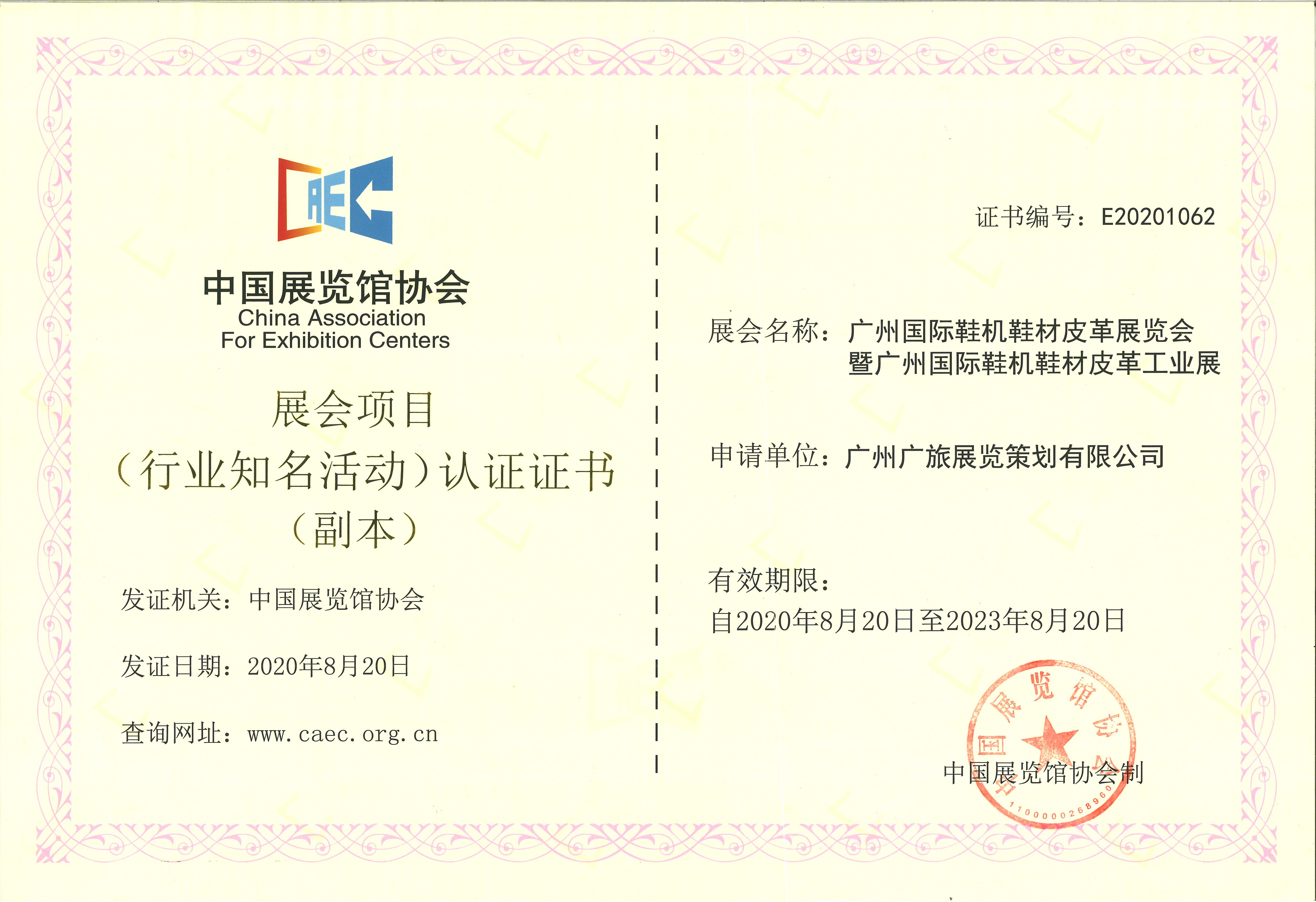 獲中國展覽館協(xié)會認證2021廣州國際鞋機鞋材皮革工業(yè)展再添新榮譽